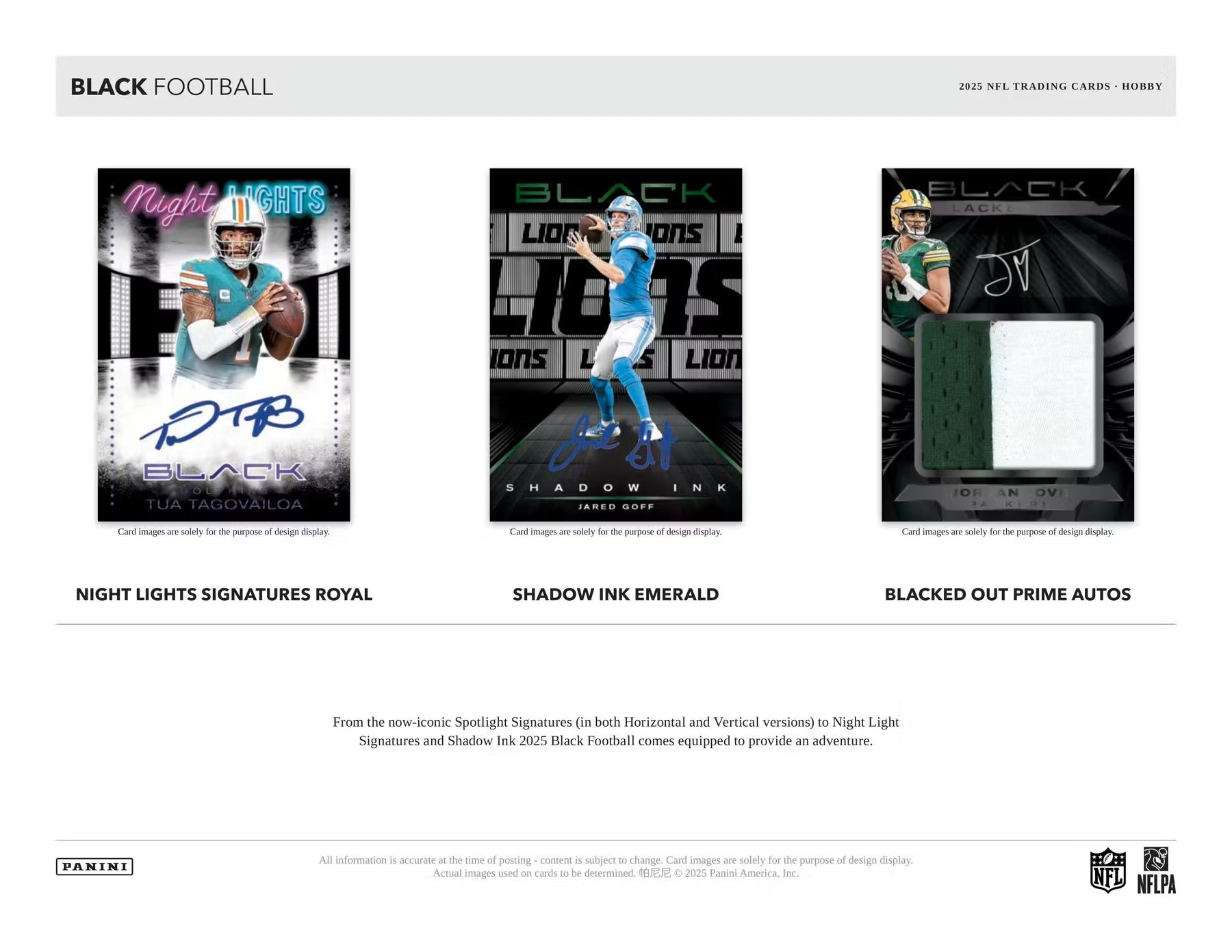 From the now-iconic Spotlight Signatures (in both Horizontal and Vertical versions) to stacked autograph-memorabilia content from the most desirable rookies, 2025 Black Football comes equipped to provide an adventure.